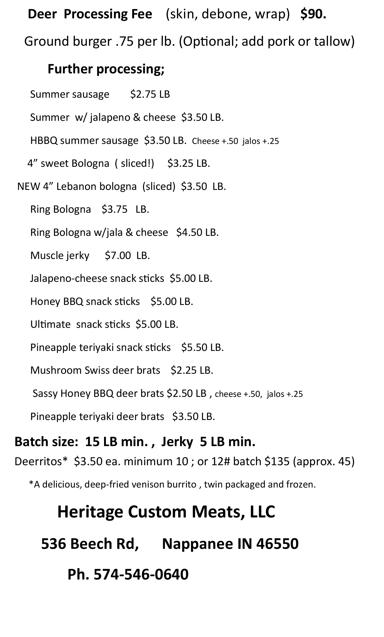 - Deer Meat Processing: At Heritage Custom Meats LLC, we take pride in providing high-quality, clean, and careful deer processing from start to finish. Whether you bring in a whole deer or deboned meat, we ensure every cut is handled with precision and respect. From standard cuts to specialty prep, your venison is processed exactly the way you like it—fresh, flavorful, and ready for the freezer.